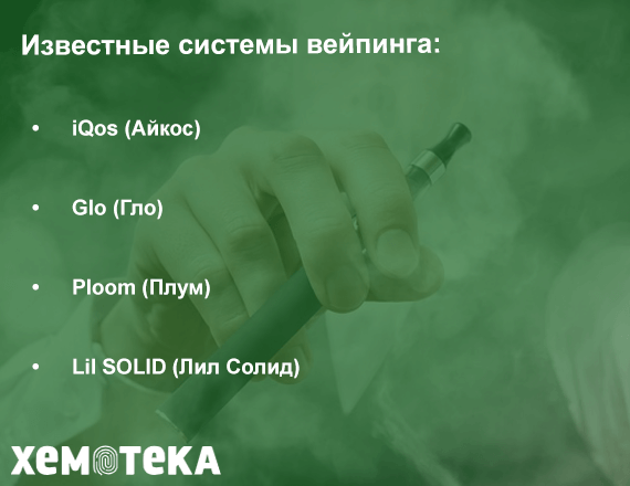 HTP нагревают табак, производя пар. Среди них самые известные системы – iQos (Айкос), Glo (Гло), Ploom (Плум), Lil SOLID (Лил Солид).