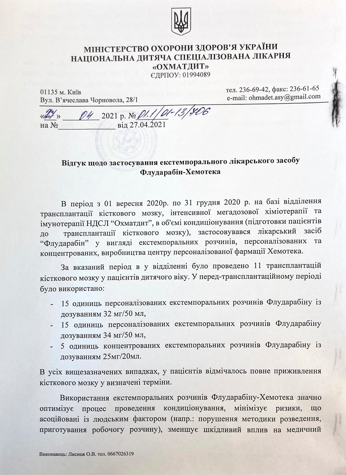 «В период с 1 сентября 2020 г. по 31 декабря 2020 г. на базе отделения трансплантации костного мозга, интенсивной мегадозовой химиотерапии и иммунотерапии НДСБ «Охматдет», в объеме кондиционирования (подготовки пациентов к трансплантации костного мозга), применялся препарат «Флударабин» в виде экстемпоральных растворов, персонализированных и концентрированных производства Центра персонализированной фармации «Хемотека».