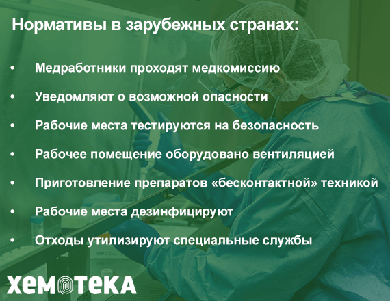 В разных странах стандарты и требования при работе с химиотерапевтическими препаратами могут различаться.