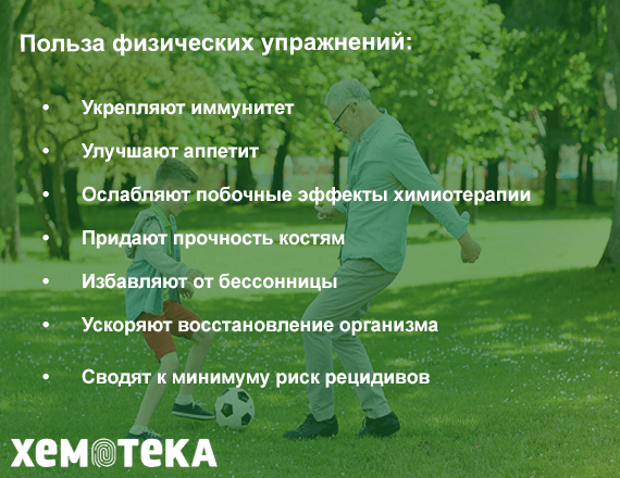 Многочисленные исследования показали позитивное влияние дозированных физических нагрузок на организм как здоровых людей, так и онкобольных. Негативные результаты отсутствуют.