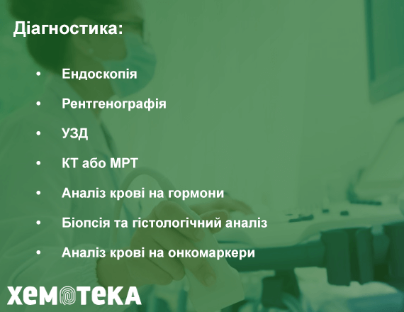 Щоб виявити пухлини, розташовані всередині тіла, проводять інструментальну діагностику: ендоскопію, рентгенографію, УЗД, КТ, МРТ. При гормональнозалежних пухлинах роблять аналіз крові на гормони. Якщо з’являється підозра на злоякісний процес, то виконують біопсію та гістологічний аналіз отриманого біоматеріалу, досліджують кров на онкомаркери.