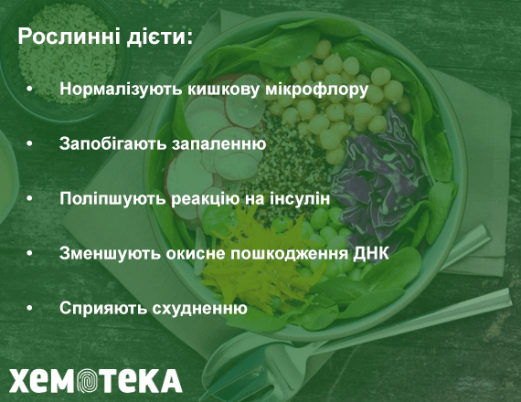 Рослинні дієти підвищують концентрацію корисної мікрофлори в кишечнику, запобігають запаленню, покращують реакцію на інсулін, зменшують окислювальне пошкодження ДНК, сприяють схудненню, а, отже, мінімізують ймовірність розвитку злоякісних процесів.